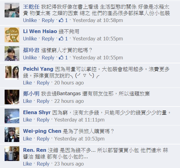 我突然想到我在菲律賓超市看到的小包裝日用品,就問他這是怎麼一回事!